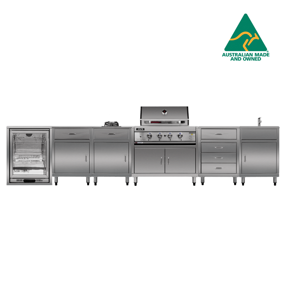 You'll find ample storage throughout, with plenty of space below the BBQ, wok burner, and base cabinet. The 4-drawer module, featuring soft-close slides, rounds off the generous storage solutions. All cabinets are Australian-made from premium 304-grade stainless steel, ensuring they are incredibly durable and easy to clean, maintaining their pristine appearance for years to come.
