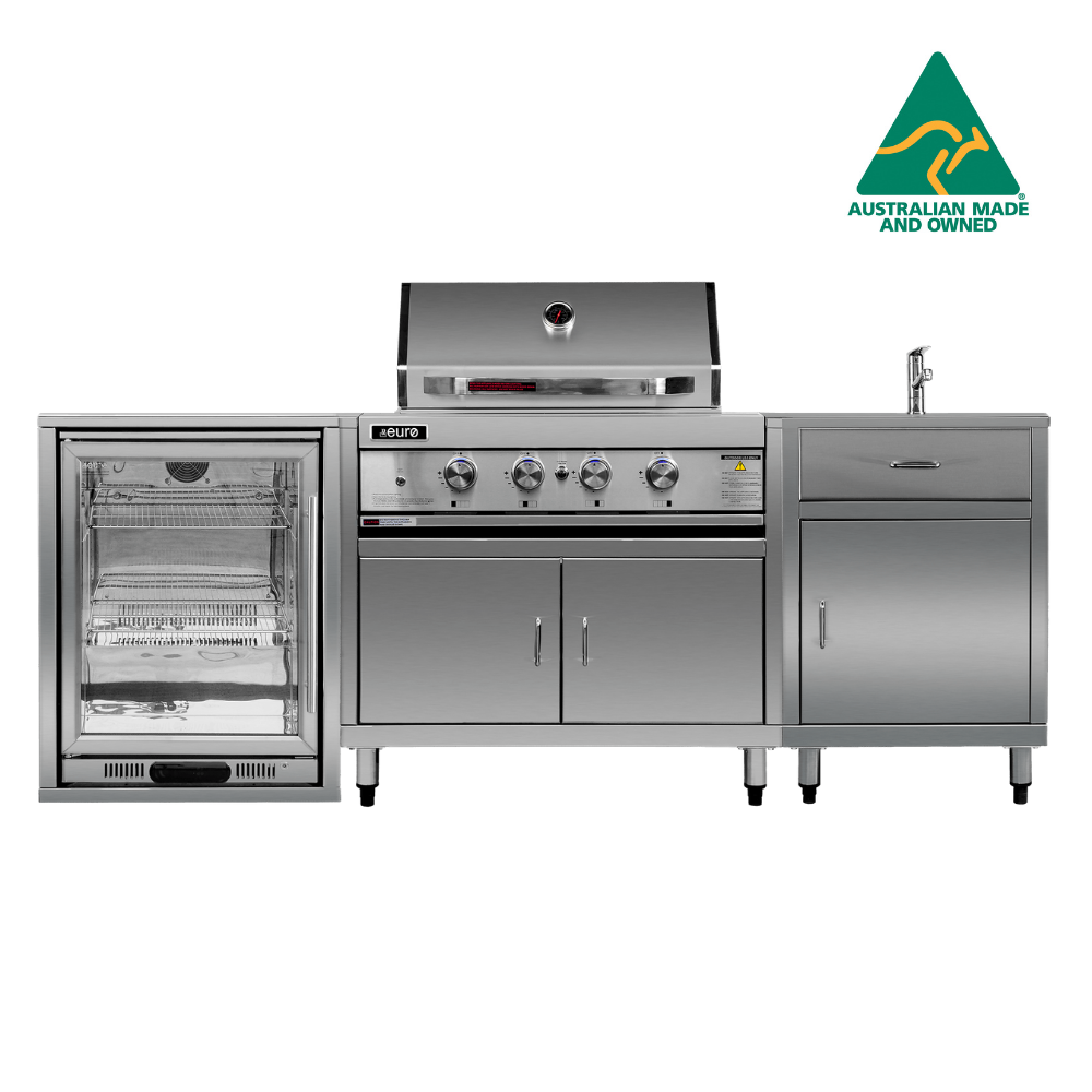 This package also includes a versatile sink module with a Dorf sink mixer and a pressed stainless steel sink, fully welded into the bench top for a seamless finish. A generously sized Euro single-door cooler is also included to keep all your drinks perfectly chilled. All cabinets are Australian-made, handcrafted from 304-grade stainless steel to be durable and easy to clean.