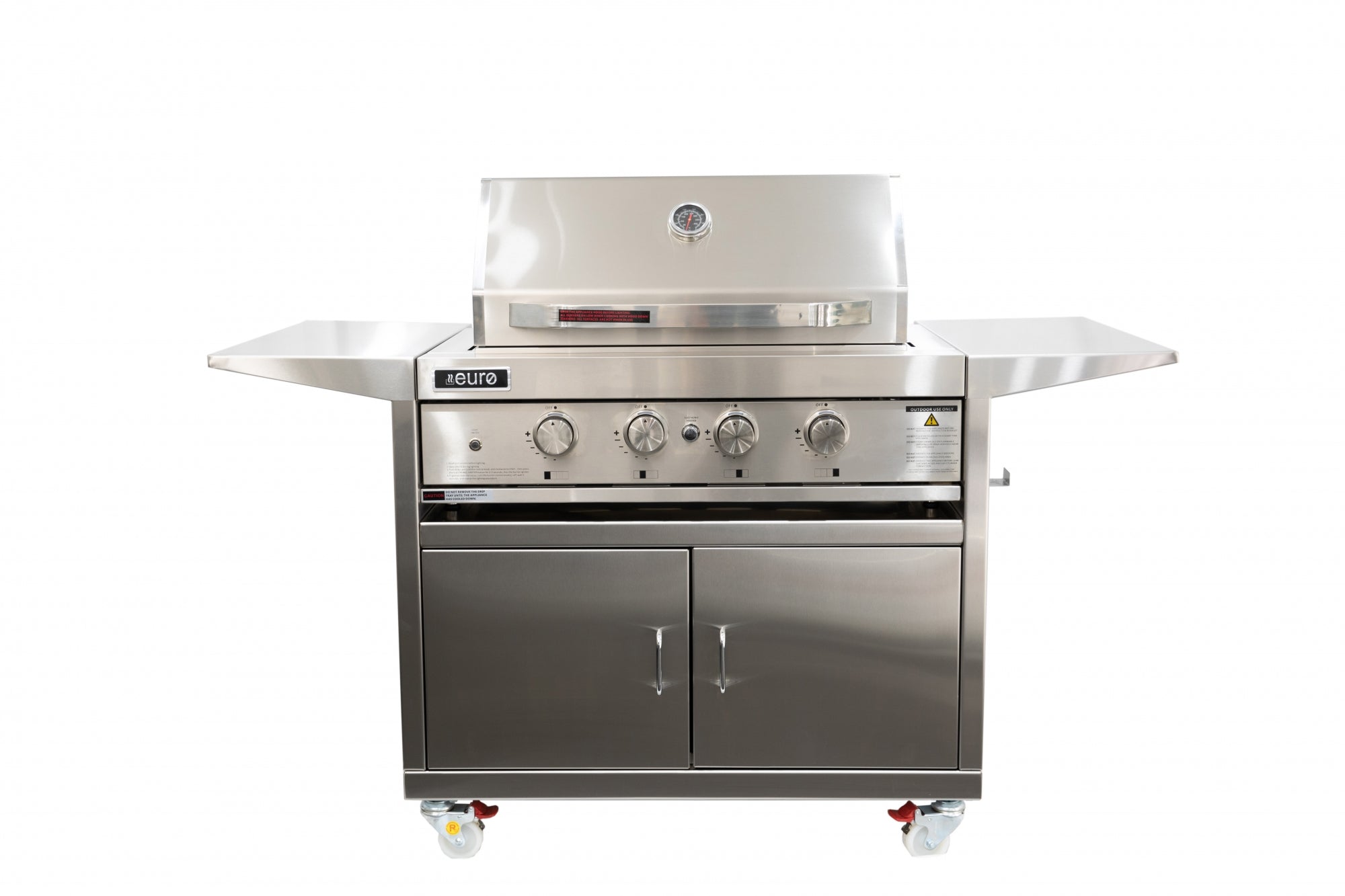 The EURO 900 Stainless Steel 4 Burner Built-In BBQ with Roasting Hood is the ultimate outdoor cooking machine, now with added mobility and convenience thanks to the Cronin Alfresco mobile BBQ stand. The high-quality EURO BBQ are available with either 4 or 6 powerful burners that provide even heat distribution, allowing you to cook a variety of foods to perfection. The roasting hood is perfect for grilling steaks or roasting chicken with the rotisserie.