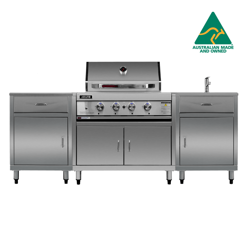 Designed to fit snugly within a 2.2m wide area (with slight variations depending on your BBQ choice), the Prospect is manufactured from 304-grade stainless steel, ensuring the BBQ and cabinets are durable and easy to clean. With a drawer and door featuring soft-close action in each cabinet, this package offers a great combination of storage space, bench size, and the essential functionality of a sink module, making it a complete kitchen in a compact footprint. The Prospect is the alfresco kitchen of your dreams.